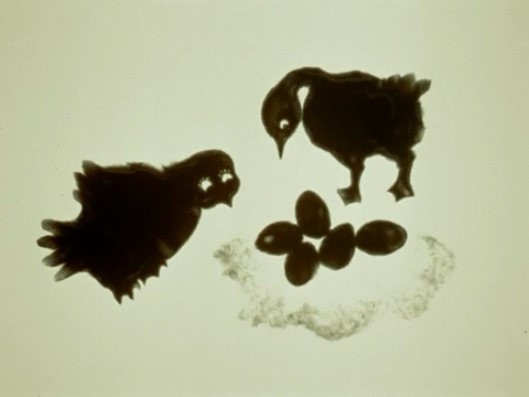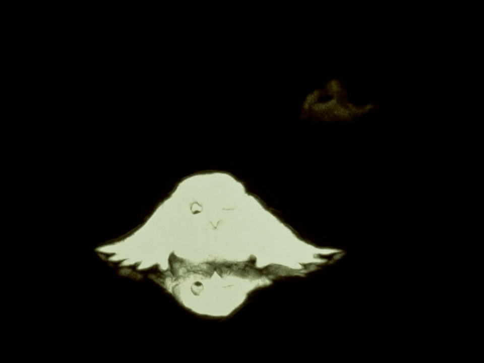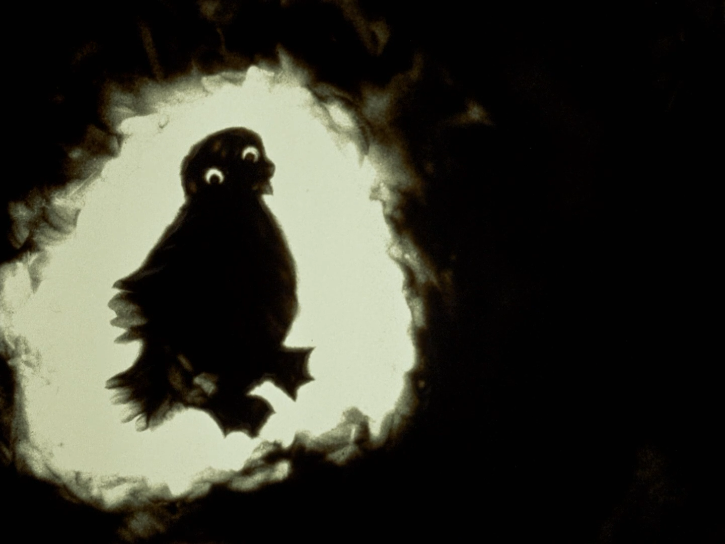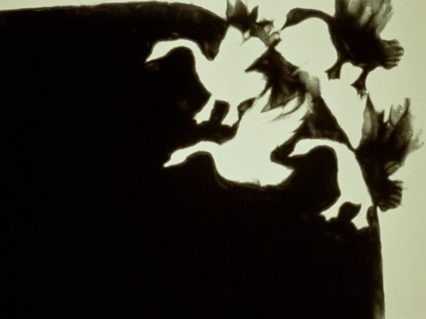 The Owl Who Married a Goose is a sand animation that adapts an Inuit legend about an owl who defies nature by marrying a goose, only to be humbled by his physical incompatibility. This film was produced by the National Film Board of Canada as a collaboration between animator Caroline Leaf and Inuk artist Agnes Nanogak – part of a series titled Eskimo Legends (an outdated term for Inuit people no longer used today). Working directly under the camera, animator Caroline Leaf sculpts each frame by hand using beach sand over a lightbox. The varying densities of sand allow for nuanced transparency, producing a rich range of tone. Leaf skillfully uses this effect to differentiate between fluid and rigid substances: tight dense clusters act as solid bodies, while fanning the grains into loose scatters suggests lightweight feathers or splashing water droplets. Layering denser forms atop lighter ones creates a strong sense of depth and dimension.